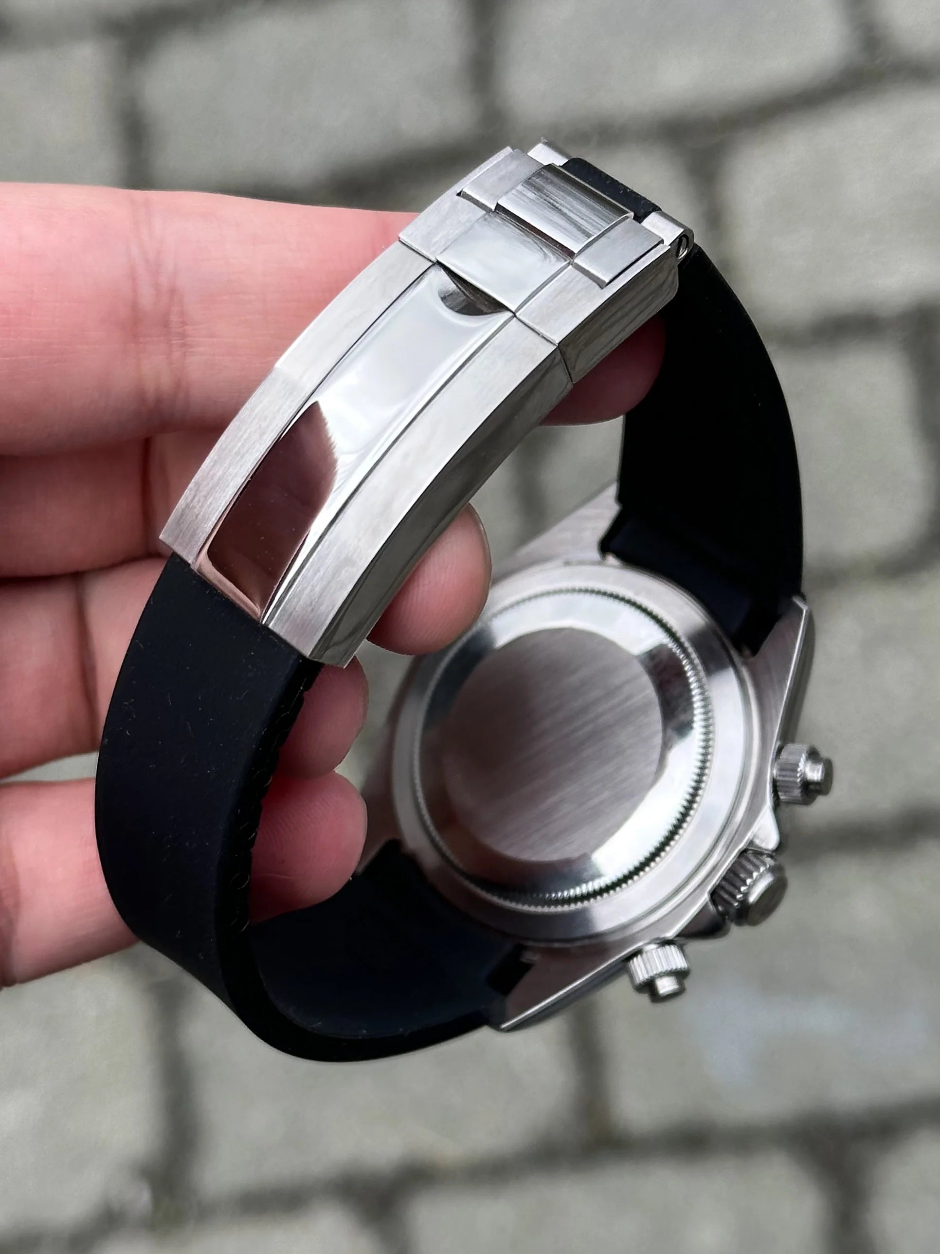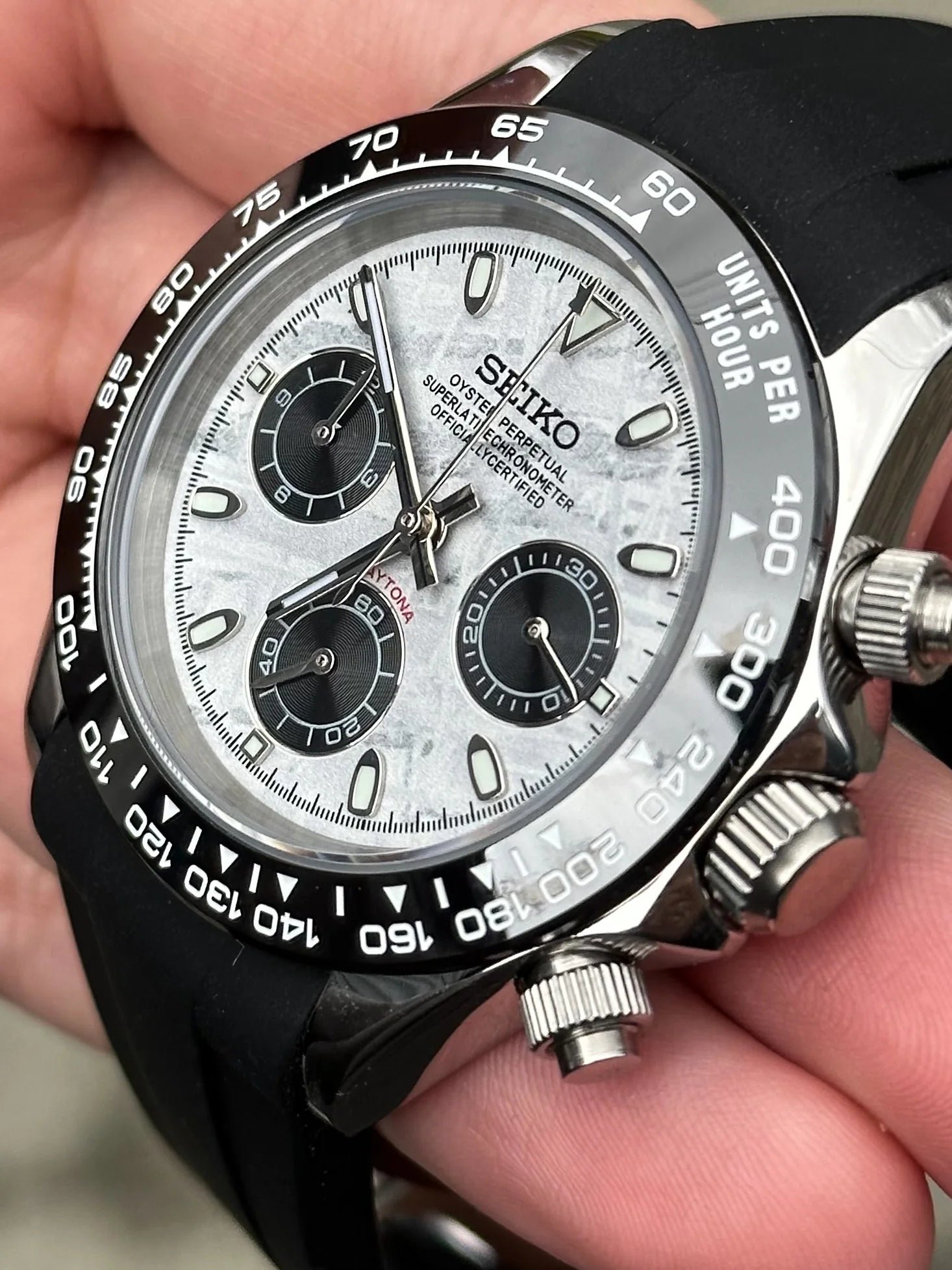 Experience the allure of the cosmos with the Meteorite Daytona Mod. This timepiece features a striking meteorite-patterned dial, capturing the essence of interstellar beauty. The chronograph sub-dials and tachymeter bezel enhance its functionality, making it a perfect blend of style and performance.